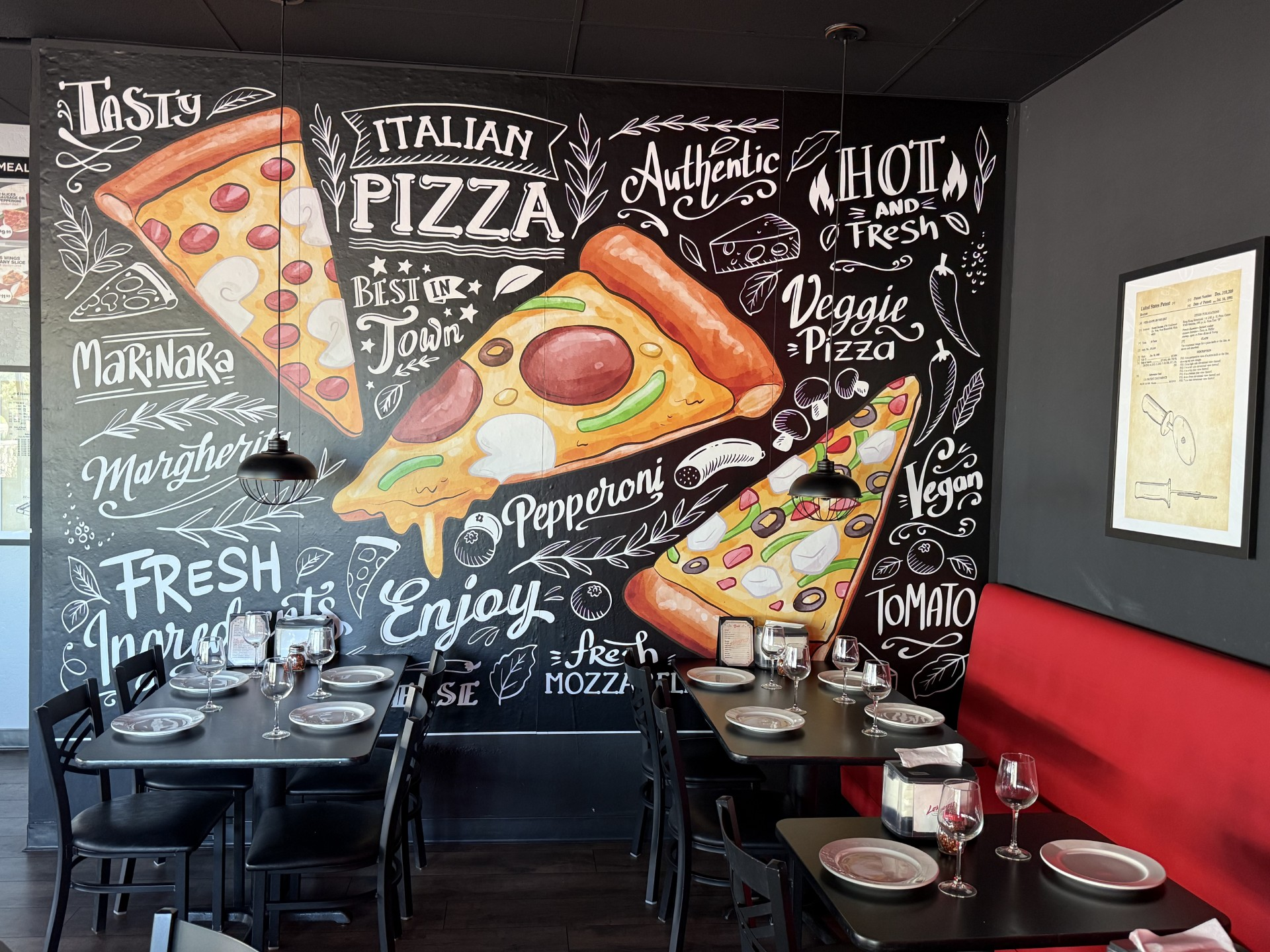 The redesigned 2,000-square-foot space brings a bold, modern edge. Guests are welcomed by a vibrant mural of pizza slices and a playful neon signs. The dining area features red accents, sleek black furniture and a cozy booth-lined wall. The modernized space has the same welcoming atmosphere, but now with a fresh personality.