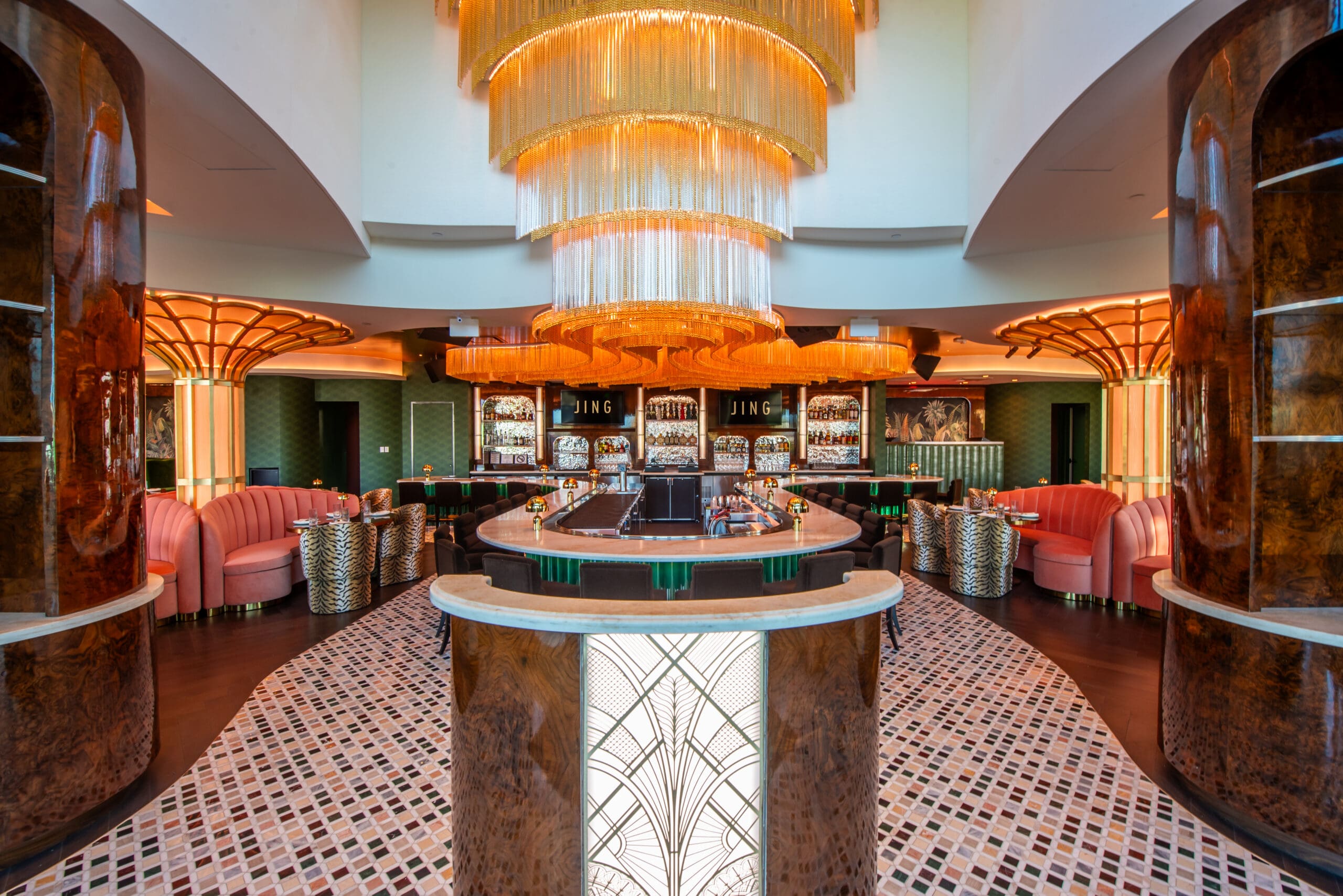 Waterfall chandeliers, plush pink banquettes and programmable lighting create the high-energy atmosphere at JING Scottsdale. (Photo courtesy of JING Scottsdale)