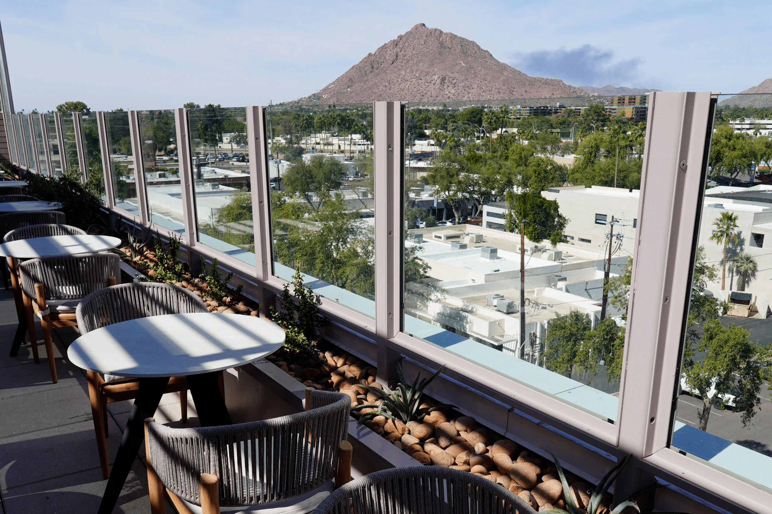 Up top, guests will find a rooftop pool with sweeping views of Camelback Mountain and the Old Town skyline, alongside a 950-square-foot, 24/7 fitness center with floor-to-ceiling windows overlooking the Valley.