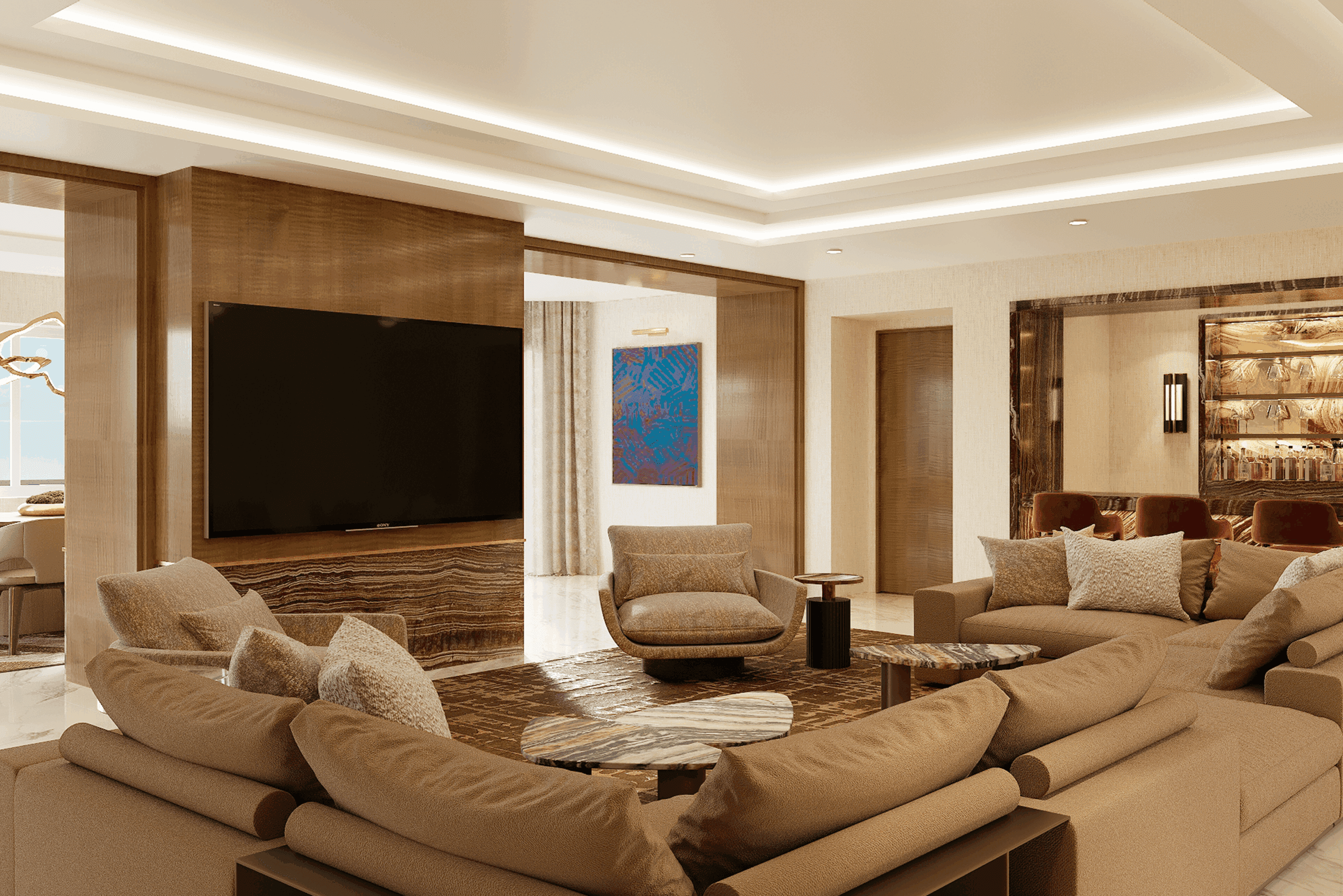 The Executive Suites boast burnished brass accents and rich walnut wood, while the Grand Suite offers a private bar and dining area, along with dramatic art installations. The Luxury Patio Suites feature European fabrics, exotic stone finishes and private patios with sweeping resort views.