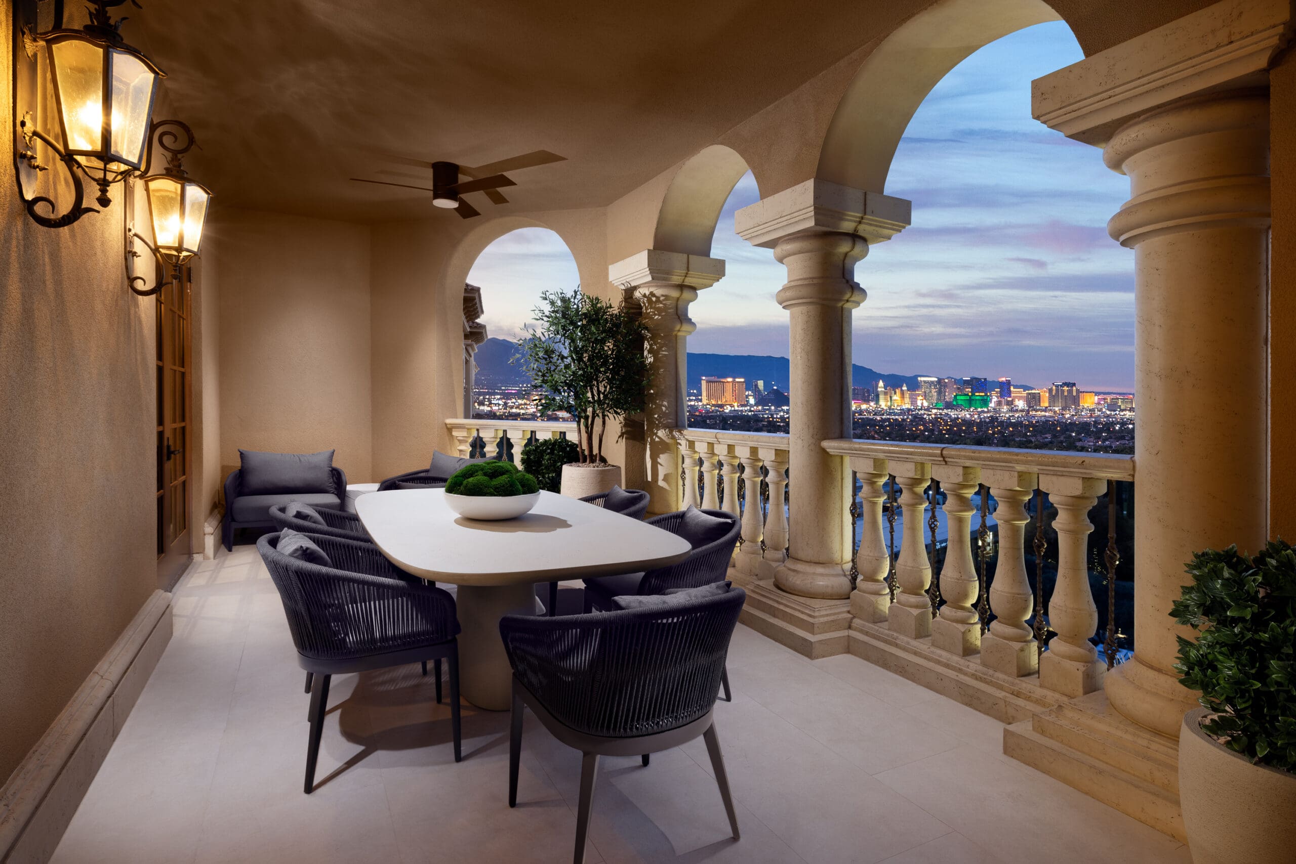 Architectural details include custom millwork in rift walnut, pearlized oak and eucalyptus veneers, while a glass-wrapped dining room opens onto an oversized rooftop patio overlooking the glittering Las Vegas Strip.