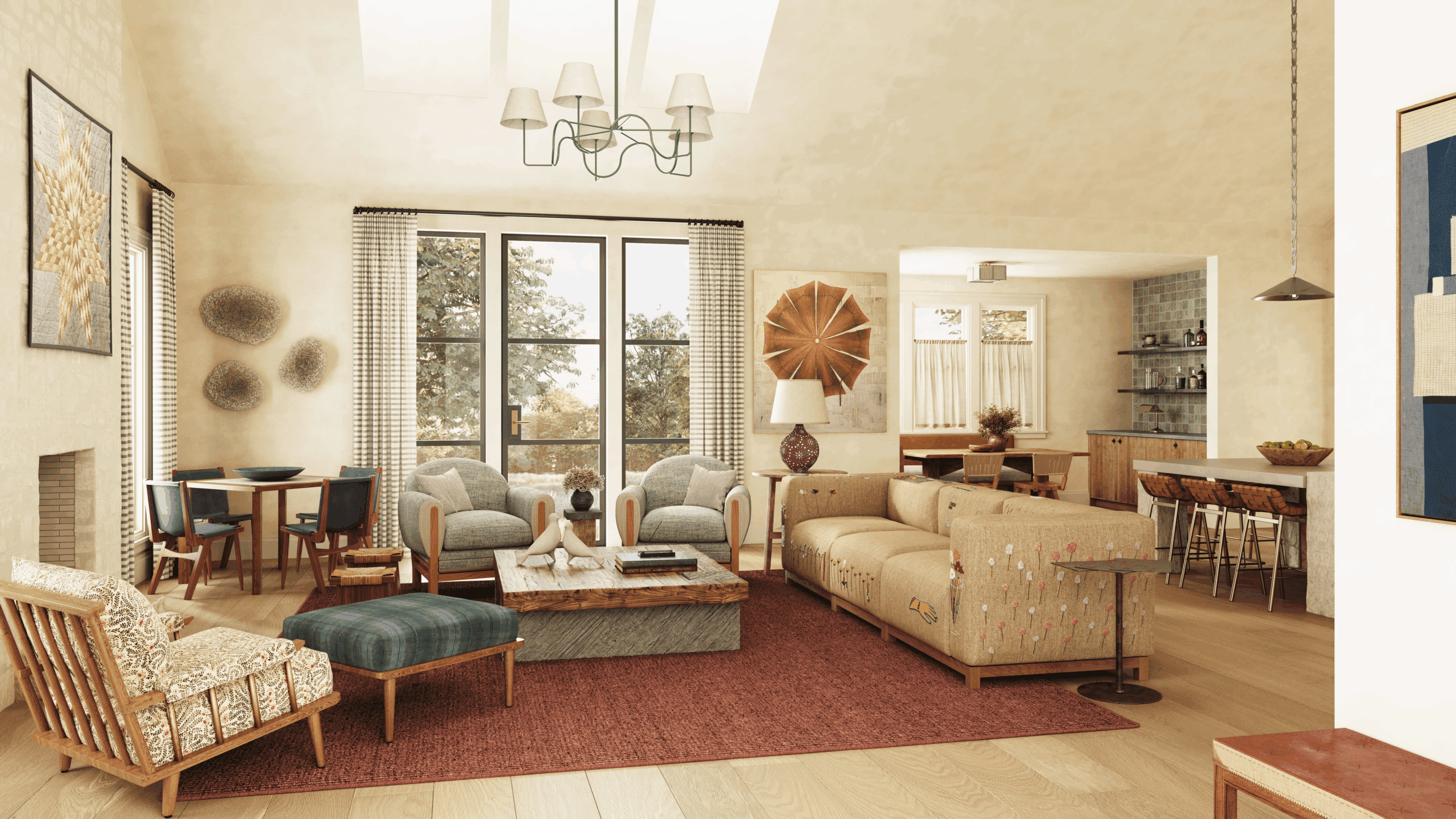 Phase one includes a 3,321-square-foot main farmhouse with three uniquely designed bedrooms as well as two 692-square-feet guest casitas. Together, these accommodations can host up to 19 guests. The second phase of development, scheduled for completion in 2027, will add two tiny homes that measure 284 square feet each along with a 3,409-square-foot event space with full service bar and catering kitchen, private back of house access, and expansive steel and glass windows overlooking the pond.