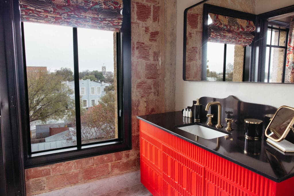 The Faust’s Spanish Colonial Revival architecture has been thoughtfully modernized, with exposed brick walls and cement columns uncovered during construction now intentionally woven into the interior design. Ornate crown moldings, expressive furnishings, bold wallpaper and whimsical art pieces add warmth and personality throughout the space, creating a layered aesthetic where history feels alive rather than archived.